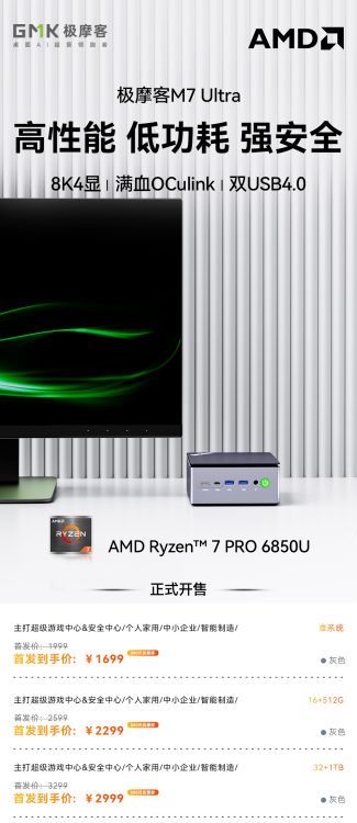 极摩客 M7 Ultra 搭载 AMD Ryzen™ 7 PRO 6850U 处理器,跑分高达 128W,不仅能为企业和个人用户提供专业级的性能输出与安全保障,搭配前置 OCulink 接口外接扩展坞后还能无损畅玩 3A 大作,办公娱乐无缝切换。散热上毫不妥协,VC 均热板稀导设计加北冰洋双风扇,即便释放 70W 满性能,机身依旧冰凉且静音无噪;拓展与显示能力更是同级领先,HDMI 2.1、DP2.0 加双 USB4.0 支持 4 屏异显,双 M.2、双 DDR5、双 2.5G 网口(Intel I226V)和 Intel Wi-Fi 6,满足存储、网络、外设的全场景连接需求。