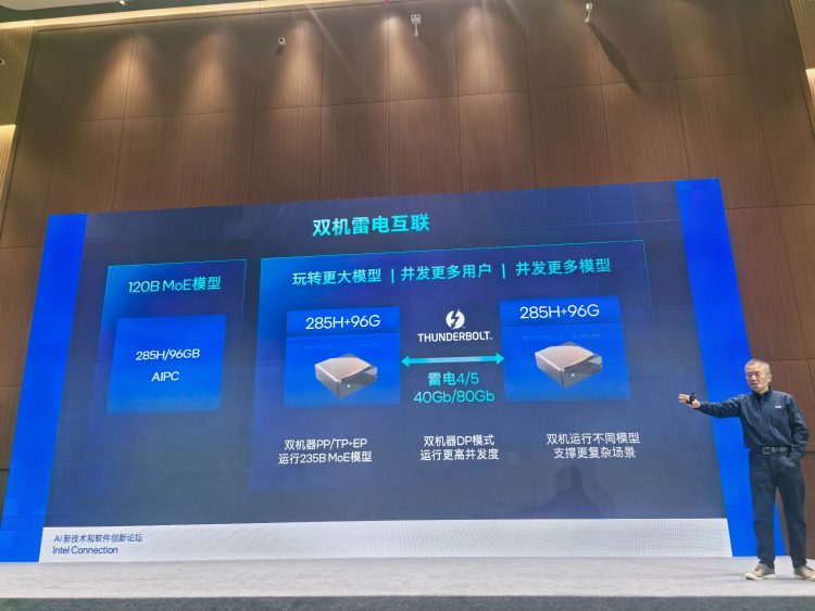 ● 雷电互联,构建本地高效算力集群:利用雷电技术可将两台酷睿Ultra 9 285H AI PC便捷互联,构建一个经济且高效的本地算力集群。该架构支持高达235B参数的大模型在双机上实现高效推理,并可在不同模型之间灵活部署和路由,胜任更复杂的AI任务。