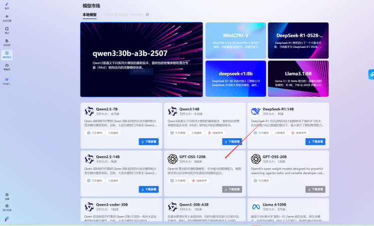 进入模型商店,选择 OPEN AI GPT-OSS-120B 本地模型,无需额外配置,即刻使用。