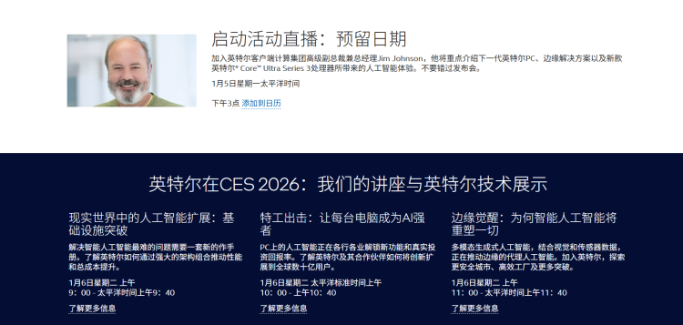英特尔客户端计算集团高级副总裁兼总经理Jim Johnson,他将重点介绍下一代英特尔PC、边缘解决方案以及新款英特尔Core Ultra Series 3处理器所带来的人工智能体验。