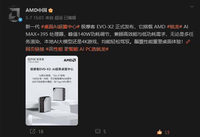 AMD表示:“极摩客EVO-X2成功挖掘了Ryzen™ AI Max+平台的性能潜力,为AI PC的形态创新提供了优秀范本。双方的深度合作,将加速AI技术在消费级桌面终端的普及,推动端侧AI生态的繁荣发展。”