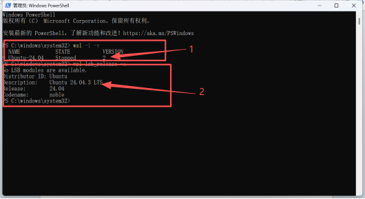 管理员运行 Woindows PowerShell –>wsl -l -v –>wsl lsb_release -a –>查看是否用Wsl2跟Ubuntu24
