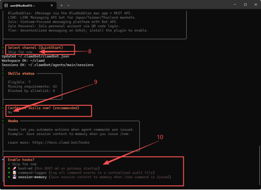 skip for now –>No –>空格键选择boot-md/command-logger/session-memory按Enter确认 –>Hatch in TUI –>按Ctrl+C 暂停clawdbot