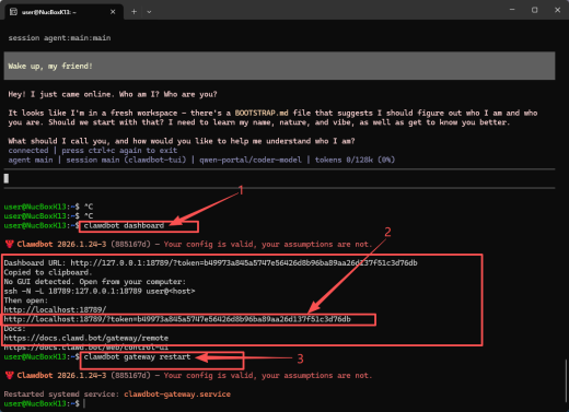 输入:clawdbot dashboard –> 复制网站到浏览器授权 –>clawdbot gateway restart(重启网关指令)