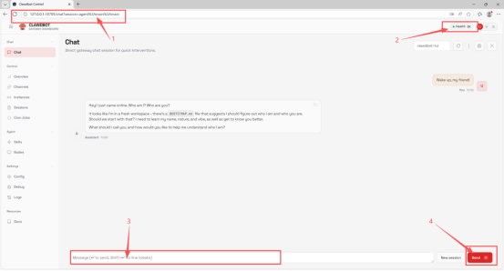 在浏览器输入:http://127.0.0.1:18789/ –>右上角显示Health Ok代表已经成功,可以正常提问或指挥做什么