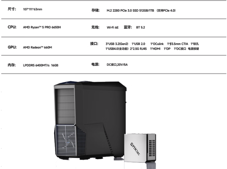 核心性能上,极摩客M8搭载锐龙R5-6650H移动处理器,该处理器广泛应用于笔记本与迷你主机领域,基于6nm Zen3+架构打造,拥有6核心12线程,最高加速频率可达4.5GHz,峰值TDP为40W。无论是多任务办公、代码编译,还是轻度图文、视频创作,都能从容应对,兼顾性能与能效,无需担心卡顿问题。