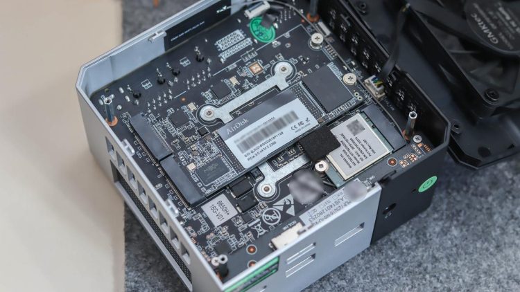 别看极摩客M8体积小巧,后期拓展性却毫不逊色,支持固态、网卡等硬件的自主升级。机身背部配备四个快拆螺丝脚垫,无需复杂工具,拆开合金C壳即可看到内部风扇,拆解便捷,小白也能轻松操作。
