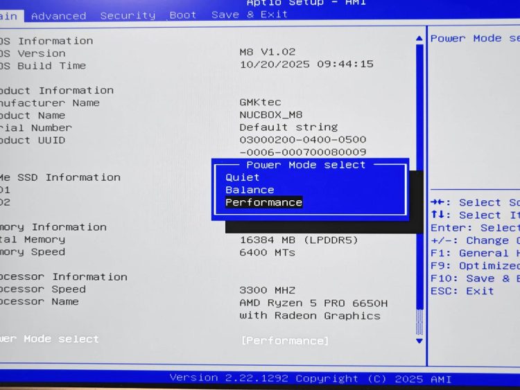 这台主机支持安静、平衡和性能三模式切换,区别就在于功耗、噪音和性能,开启性能模式后,主机性能会全力输出,当然散热压力也会加大、风扇转速变快,这个可以根据自己的实际使用场景自行在BIOS种进行设定。