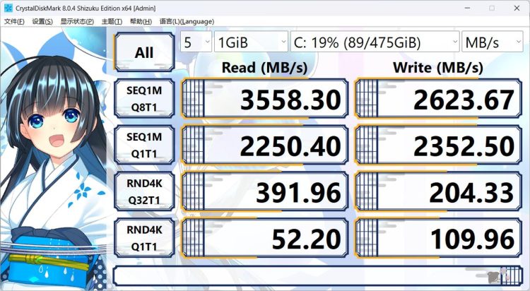 CrystalDisk硬盘跑分测试中,连续读写和写入速度分别为3558MB/s、2623MB/s,随机4K读取速度52MB/s,写入速度1094MB/s,这款PCIe3.0固态表现还是非常不错的。