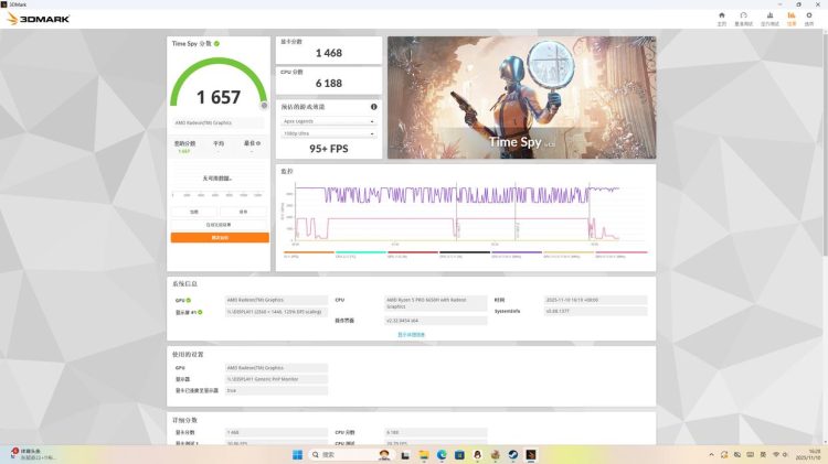 在Time Spy的测试结果中可以看到显卡得分1468,CPU得分为6188,测试总分为1657,预估在1080P画质下Apex游戏中可以有95+FPS帧率。
