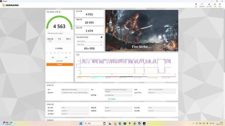 在Fire Strlike中可以看到总得分为4563,其中显卡分数为4931,物理得分为20595,预估Apex游戏中1080P画质下有95+FPS帧率。