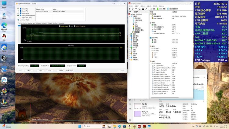 在进行“双烤”的时候,风扇转速比较高,这时使用分贝仪在机身50公分的位置进行测试,可以看到43.5dB,如果是日常处理表格、浏览网页等小负载厂家下使用,非常安静,基本可以忽略。