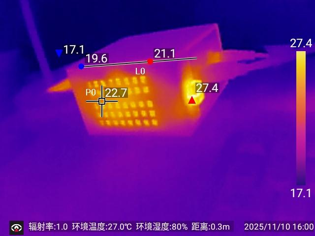 使用测温枪对壳体进行测试,可以看到外壳温度最高位置为27℃。